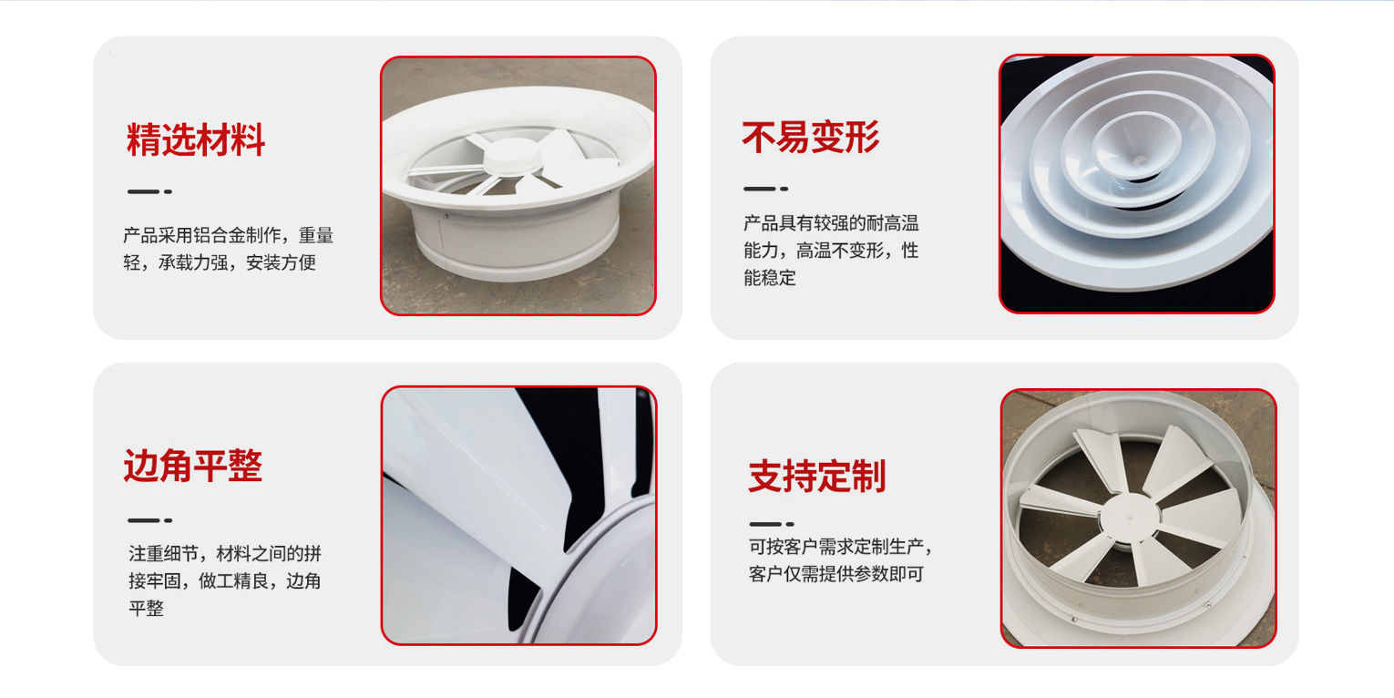 旋流風(fēng)口可分為手動(dòng)旋流風(fēng)口,電動(dòng)旋流風(fēng)口兩種。 手動(dòng)旋流風(fēng)口:必須人為手動(dòng)調(diào)制相應(yīng)角度才能送風(fēng)。 電動(dòng)執(zhí)行機(jī)構(gòu)型:電動(dòng)旋流風(fēng)口可用開關(guān)控制,220V電動(dòng)控制調(diào)節(jié)葉片來調(diào)節(jié)風(fēng)量大小,隨意調(diào)至送風(fēng)角度。